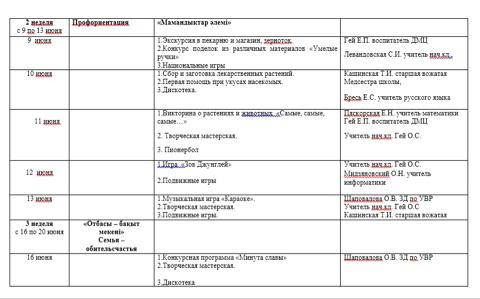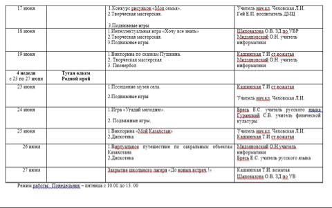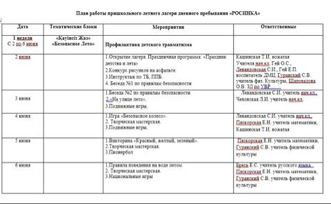 План Лагеря «Росинка» — КГУ «Отдел образования Тайыншинского района» КГУ «Подольская базовая школа»